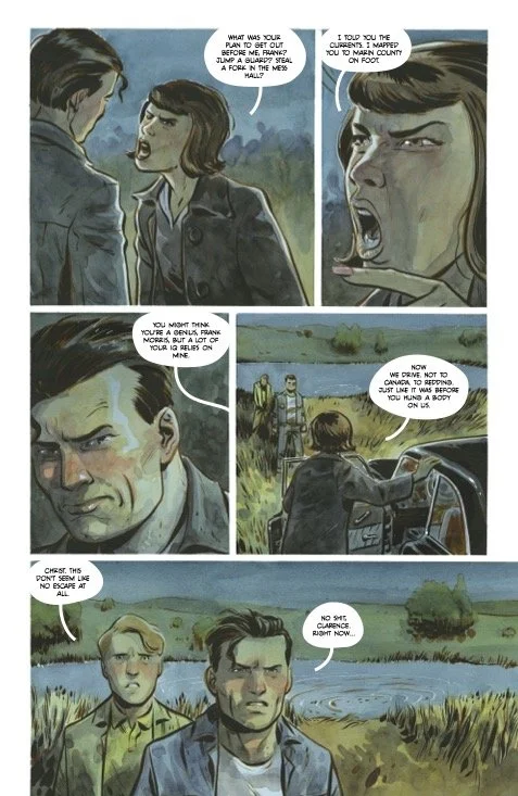 Convicts Frank Morris and Clarence Anglin have washed ashore in San Francisco after surviving their infamous escape from Alcatraz Federal Penitentiary in June 1962. They soon meet their gruff and disappointed handler, a mysterious young woman who’s also running from something, and hope to quickly get their way north to the border – if they can even make it out of Modesto alive. As a dogged federal manhunt and chance encounters threaten the desperate convicts, everyone involved is about to discover the same bloodstained truth: life on the run is an even more hellish prison than Alcatraz could have ever been.