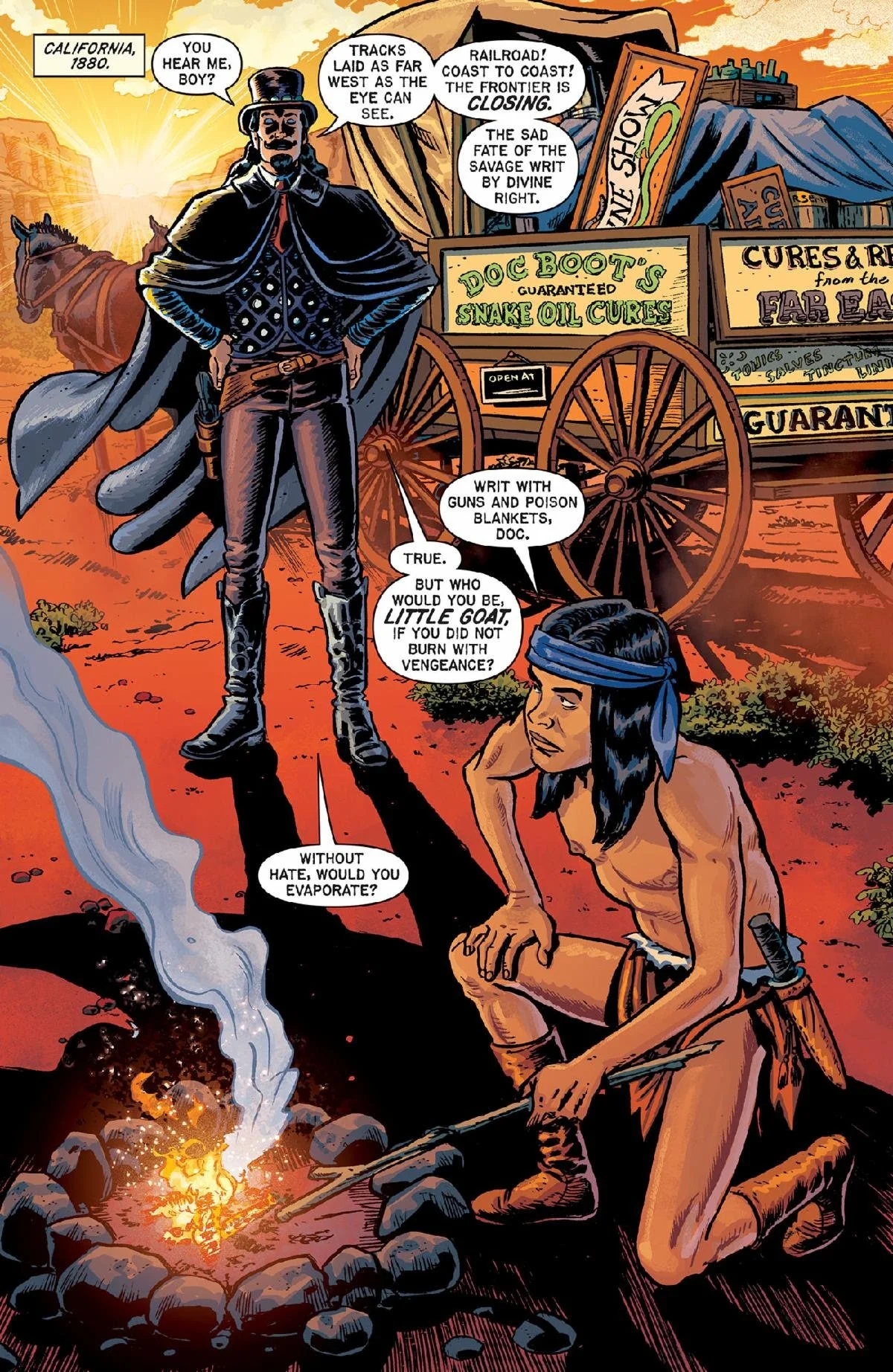 Here, for the first time, Oni Press and EC Comics can reveal a peek through the saloon doors to what awaits inside OUTLAW SHOWDOWN #1 with a sly gander at two surefire-hit stories: “Fire in the Hole” by Eisner Award nominee Tony Moore and “The Cure” by comic legends Ann Nocenti & David Lapham.