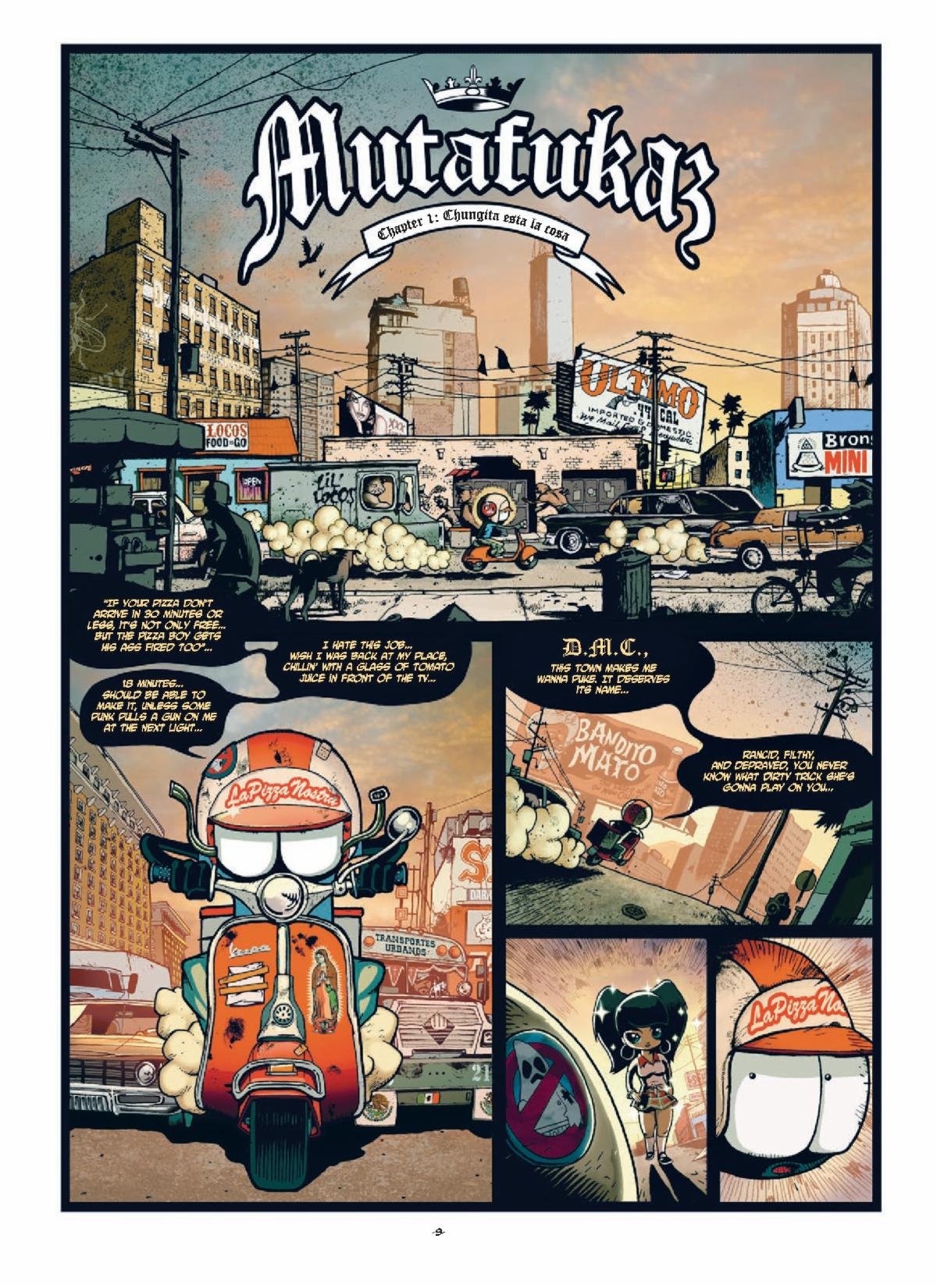 MFKZ follows the adventures of Angelino. His best friend Vinz has a flaming skull for a head, and their apartment is filled with pet cockroaches. As if that isn’t weird enough, their lives are turned upside down when a scooter accident plunges him into a hurricane of unimaginable troubles, with the fate of humanity on the hook. Heavily armed men in black, gangs of all kinds, and a troop of Mexican wrestlers all collide to face off against vicious cosmic entities determined to invade the planet!