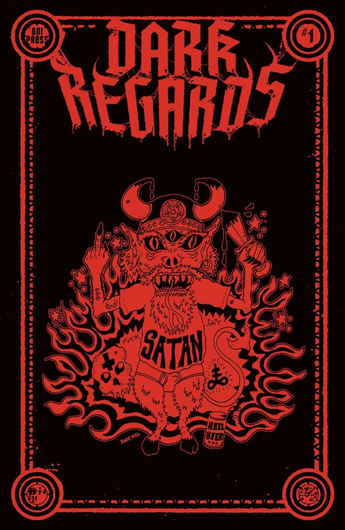 WE’RE NOT KIDDING: GIRD YOUR LOINS FOR DARK REGARDS #1 – keeping the scene alive in comic shops everywhere on May 13th with covers by Artyom Topiin (Cruel Universe, I Hate This Place), Andrew Krahnke (GI Joe: A Real American Hero – Silent Missions, Bloodrik), Scott Sugiuchi (Estrus: Shovelin’ The Sh*t), Brian Level (Razorblades, Night People) and a highly limited,1:50 HUMAN BLOOD VARIANT cover illustrated by Dave Hill himself … and printed with ink that contains the ACTUAL BLOOD of writer Dave Hill, series editor Karl Bollers, and Oni President & Publisher Hunter Gorinson. (Gross! Also: Awesome!)