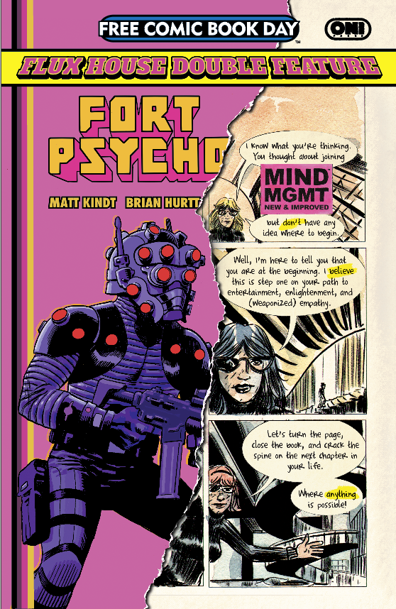 PORTLAND, OR (December 11, 2025) – IN 2026, THE COUNTDOWN TO THE MUST-READ CREATOR-OWNED COMICS EVENT OF THE SUMMER BEGINS ON FREE COMIC BOOK DAY! Oni Press – the multiple Eisner and Harvey Award-winning publisher of groundbreaking comics and graphic novels since 1997 – is proud to reveal that it is joining Free Comic Book Day 2026 with the MIND MGMT / FORT PSYCHO FCBD 2026 SPECIAL – arriving in comic shops everywhere on May 2nd, 2026 and jointly available for order by participating retailers through both Universal Distribution and Lunar Distribution.