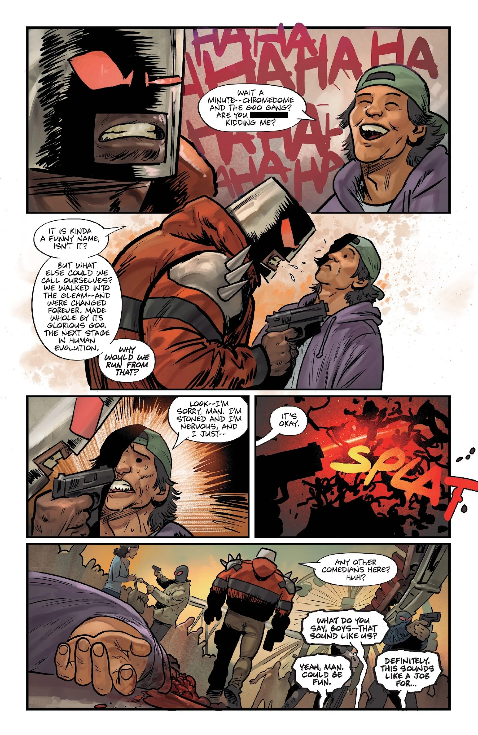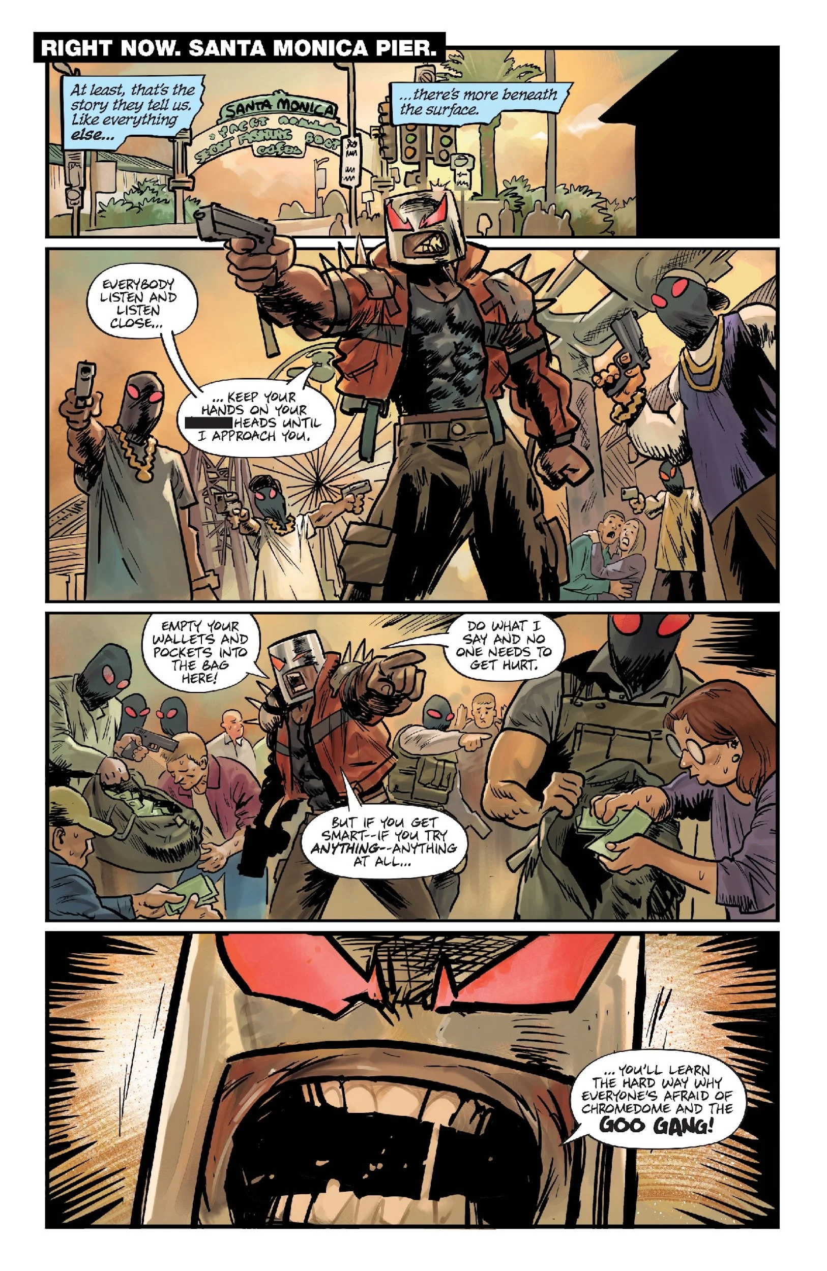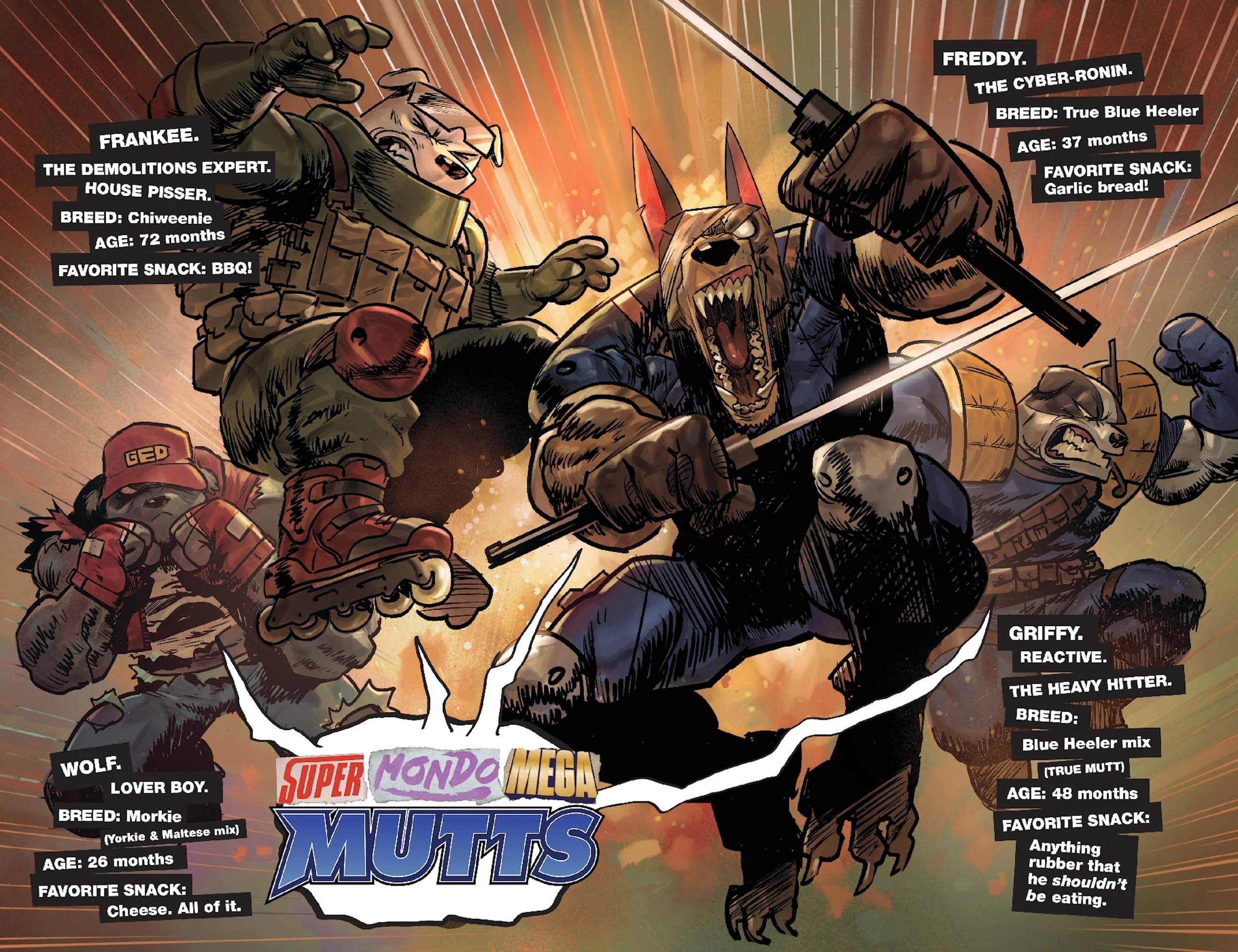 One year ago, a fragment of an inter-dimensional civilization collided with Downtown L.A. – creating an impregnable no-man's-land where the laws of physics no longer apply. Convinced that no human being could survive the terrain within, the US government's most morally compromised contractors decided to explore the area codenamed "The Gleam" by sending in four research animals in the hopes of capturing its precious technological wonders. They were hoping to find a new kind of weapon. What they got instead was four radically transformed dogs with minds and a mission all their own. WOLF! FRANKEE! GRIFFY! FREDDY! Together with their brilliant mentor MOJO, the SUPER MONDO MEGA MUTTS are going to bring justice back to the avenues and alleyways where out-of-control federal forces and gangs powered-up by pilfered alien technology now reign. They thought they could put this band of outlaw misfits on a leash... Now the world is going to discover what happens when these mutts BITE BACK.